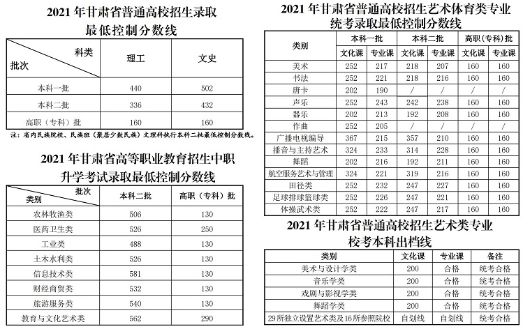 2021年甘肅省普通高校招生錄取最低控制分數(shù)線