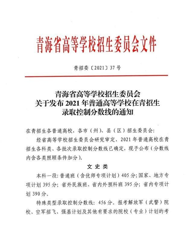 青海省2021年普通高等學(xué)校在青招生錄取控制分?jǐn)?shù)線的通知