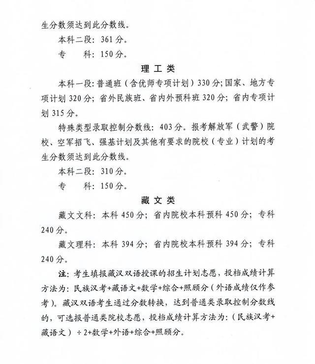 經(jīng)青海省招委會(huì)審議通過,2021年青海省普通高考錄取控制分?jǐn)?shù)線為:普通文史類本科一段405分,本科二段361分,???50分;普通理工類本科一段330分,本科二段310分,專科150分。