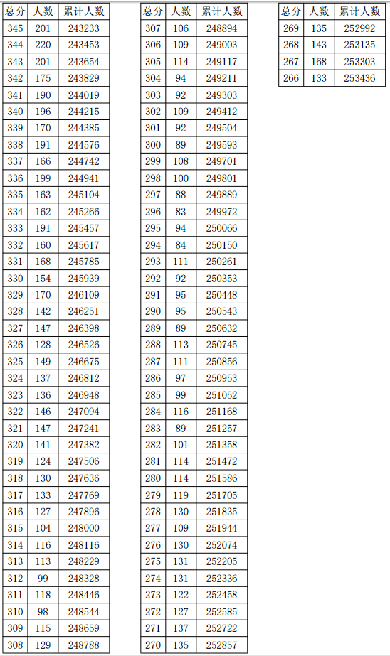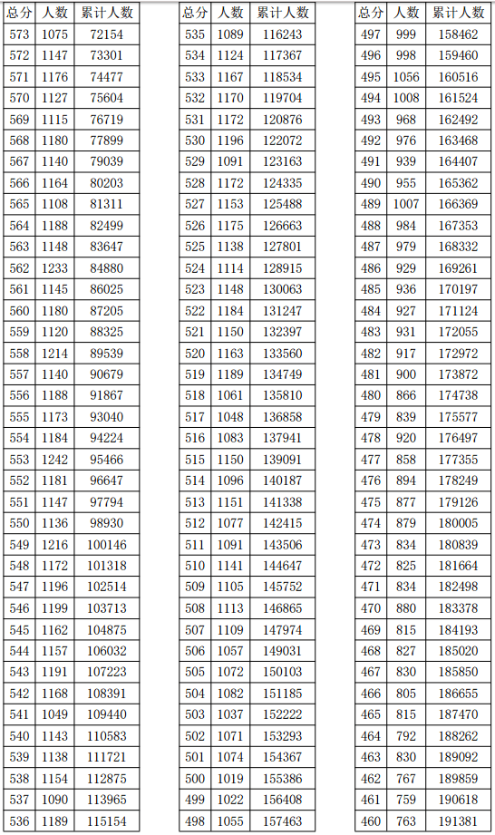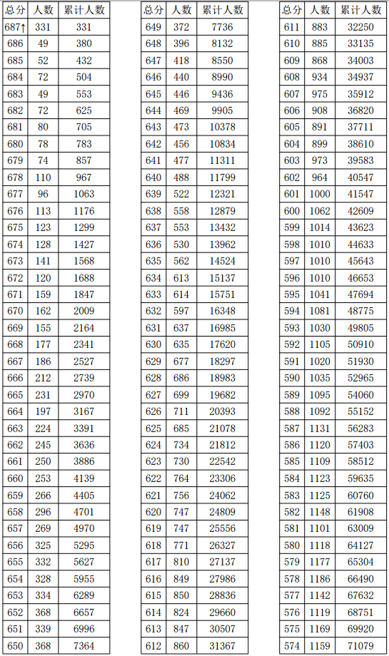 浙江省2021年普通高校招生成績分數(shù)段表(總分)