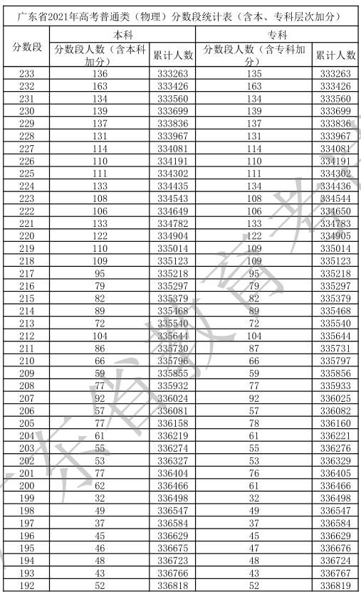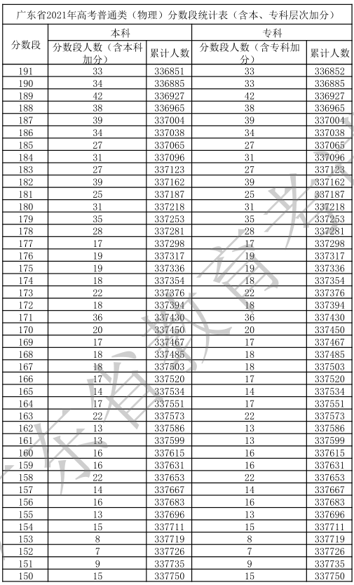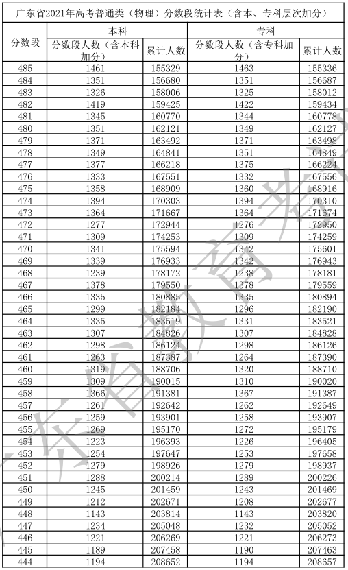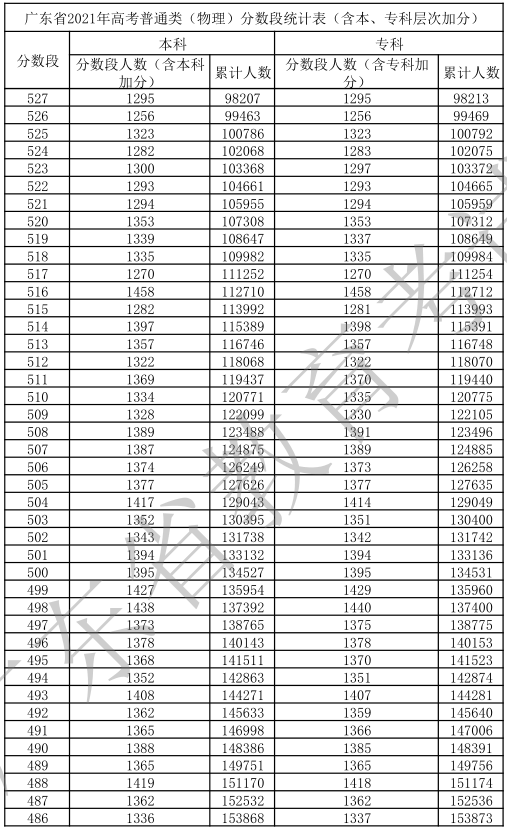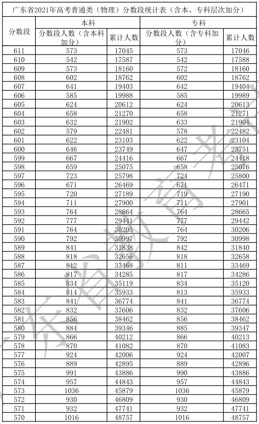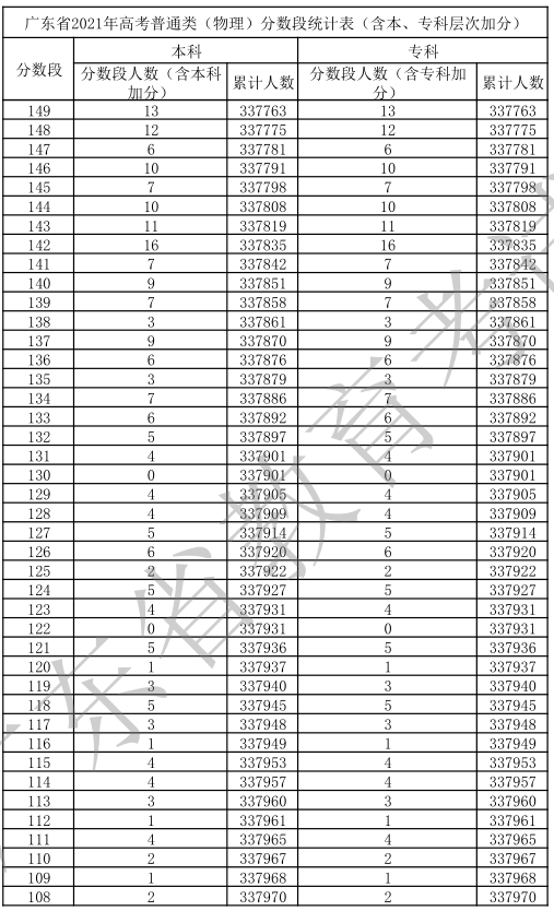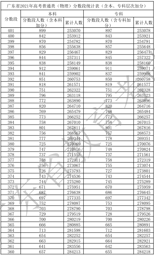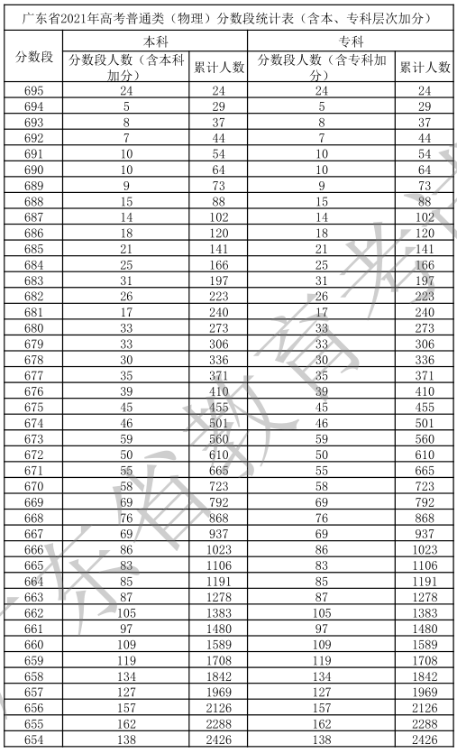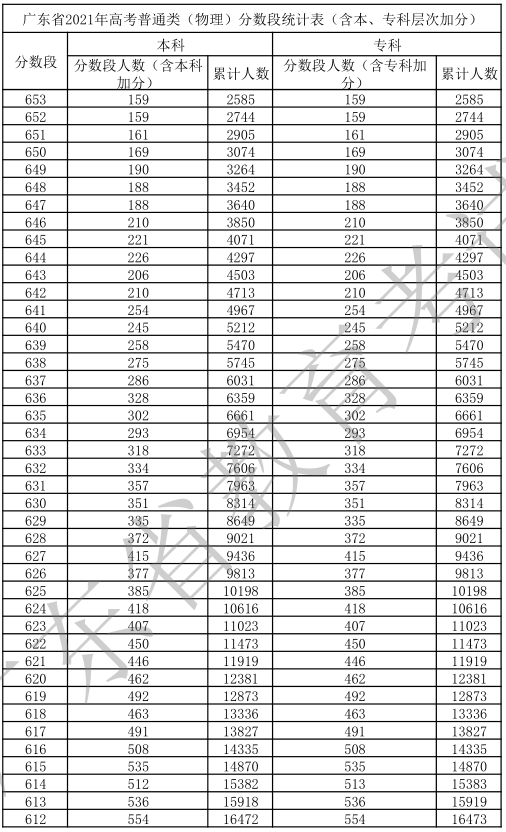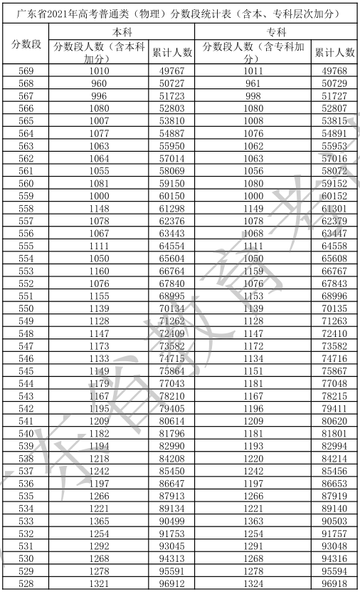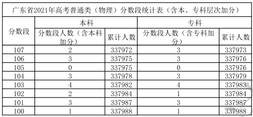 廣東省2021年高考普通類(物理)分數(shù)段統(tǒng)計表(含本、專科層次加分)