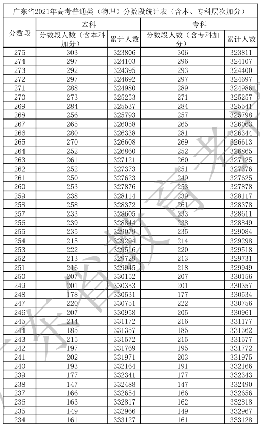 2021年廣東高考31.8萬人上線普通本科批次,一分一段表