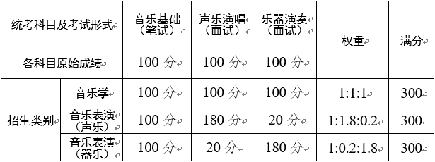 設(shè)音樂類、美術(shù)學(xué)類與設(shè)計(jì)學(xué)類、舞蹈類、播音與主持、體育舞蹈、廣播電視編導(dǎo)、書法學(xué)7個(gè)統(tǒng)考專業(yè)類別。其中參加音樂類統(tǒng)考的考生考試后根據(jù)各考試科目賦權(quán)分別獲得音樂學(xué)成績、音樂表演(聲樂)成績、音樂表演(器樂)成績,賦權(quán)表如下: