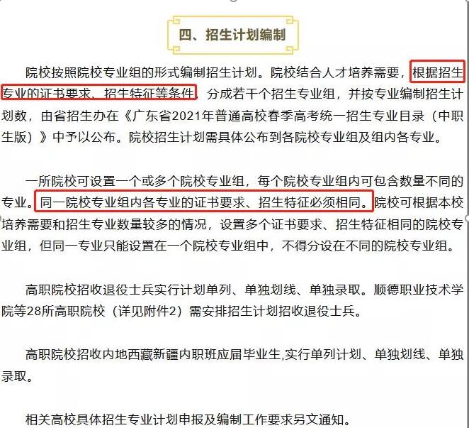 根據(jù)廣東省教育考試院文件,在2021年“3 證書”錄取中,各院校將按照招生專業(yè)的證書要求、招生特征等條件,將專業(yè)分成若干個(gè)招生專業(yè)組。