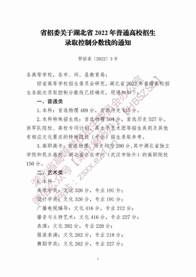 湖北省2022年普通高校招生錄取控制分?jǐn)?shù)線(xiàn)