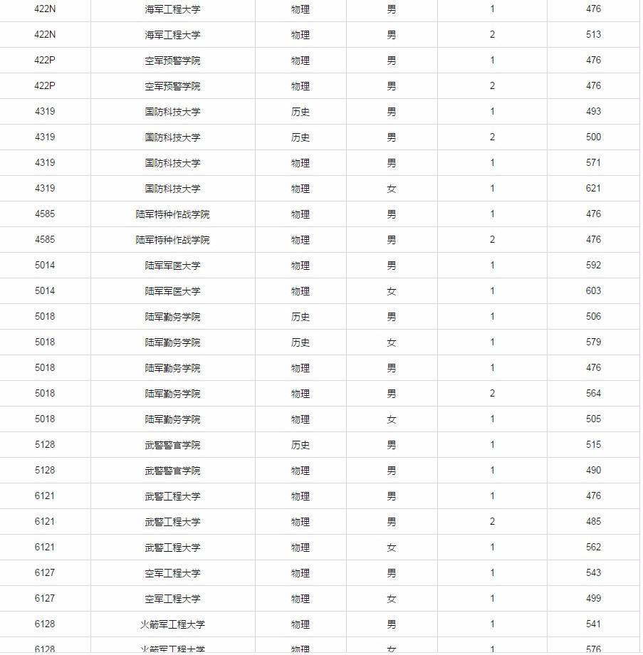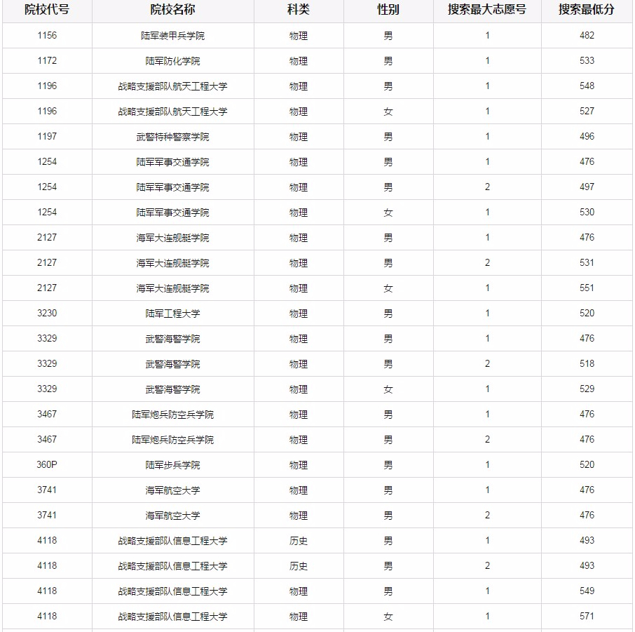 根據(jù)戰(zhàn)〔2022〕241號《關(guān)于做好重慶市2022年度軍隊(duì)院校招收普通高中畢業(yè)生政治考核、面試和體格檢查工作的通知》規(guī)定,對符合相關(guān)條件(年齡條件為截至2022年8月31日不低于17周歲、不超過20周歲)且填報(bào)有軍隊(duì)院校志愿、高考文化成績達(dá)到普通類特殊類型資格線的考生,按照志愿優(yōu)先的原則,區(qū)分院校、性別、首選科目,依據(jù)文化成績從高到低的順序,按照招生計(jì)劃數(shù)的3至5倍確定參檢對象。先搜索一志愿,再搜索二志愿。搜索最大志愿號為“1”表示一志愿軍檢生源已足,不再搜索二志愿,其搜索最低分為一志愿入圍考生最低分;搜索最大志愿號為“2”表示一志愿控制線上考生已全部入圍,其搜索最低分為二志愿入圍考生最低分。參檢院校代號為“0000”的考生為填有軍隊(duì)院校志愿但依志愿搜索未能納入面試體檢名單的考生,按照從高分到低分的順序確定,作為軍隊(duì)院校的備選生源。
