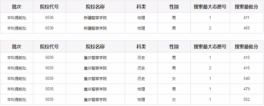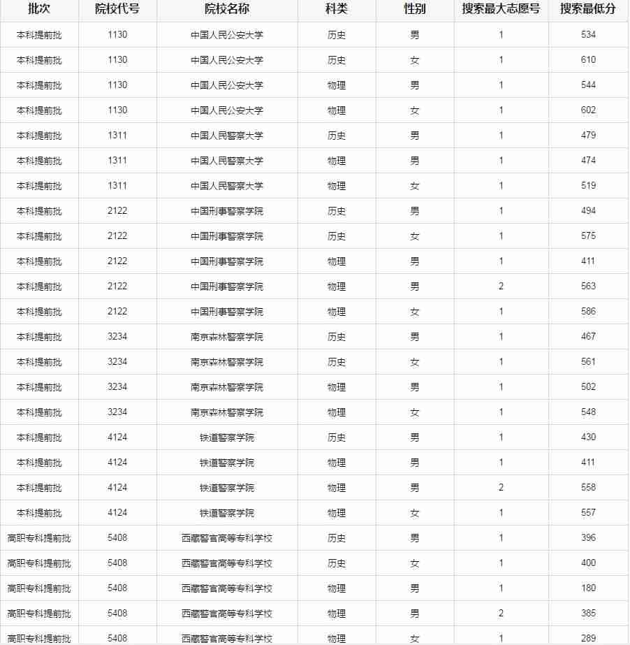 ??茖哟危簩?duì)符合相關(guān)條件且填報(bào)有公安院校志愿的重慶戶籍考生,按照志愿優(yōu)先的原則,在我市普通類??瓶刂凭€上、本科控制線以下,區(qū)分院校、性別、首選科目,從高分到低分,按照不低于招生計(jì)劃數(shù)與考生人數(shù)1:3確定。先搜索一志愿,再搜索二志愿,搜索最大志愿號(hào)為“1”表示一志愿生源已足,不再搜索二志愿考生,其搜索最低分為一志愿入圍考生最低分;搜索最大志愿號(hào)為“2”表示一志愿專科控制線上考生已全部入圍,其搜索最低分為二志愿入圍考生最低分。對(duì)于文化成績(含政策性加分)達(dá)到我市本科控制線的考生,不計(jì)比例計(jì)入。