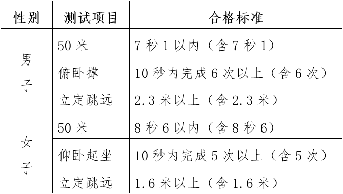 6.體能測(cè)試項(xiàng)目及合格標(biāo)準(zhǔn):