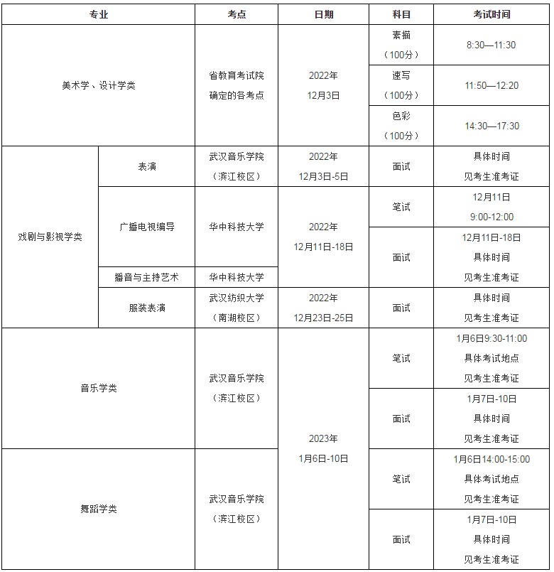 湖北省2023年藝術(shù)類各專業(yè)統(tǒng)考的考試時(shí)間安排見(jiàn)下表,考生面試具體考試時(shí)間以準(zhǔn)考證時(shí)間為準(zhǔn)。