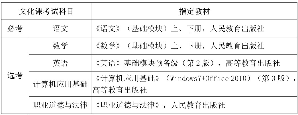 文化課考試設1門必考科目和2門選考科目。選考科目具體由招生院校根據專業(yè)培養(yǎng)需要,確定2門選考科目。考試內容為我省中職學校所開設以上課程的基本知識,各科指定教材詳見下表: