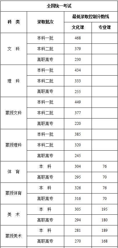 2023年內(nèi)蒙古普通高考最低錄取控制分?jǐn)?shù)線公告