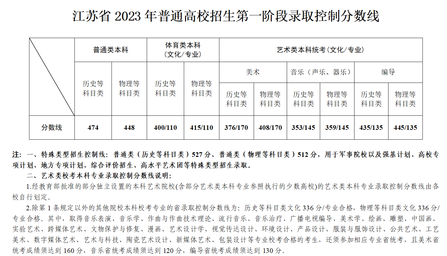 江蘇省2023年高考第一階段錄取控制分?jǐn)?shù)線