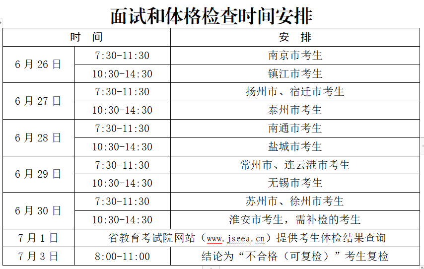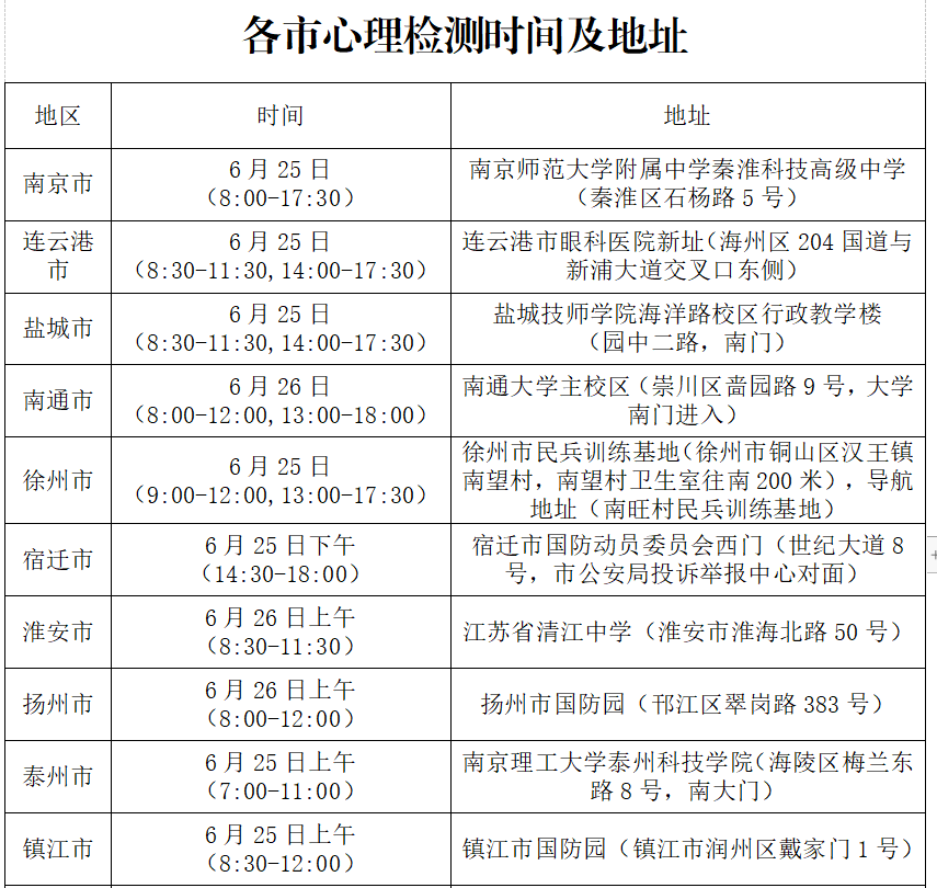 凡達到資格線且政治考核合格的考生,請于6月25日至26日持本人身份證、高考準考證、高考成績單、病史調(diào)查表、1張1寸近期彩色免冠照片,戴口罩自行到各設區(qū)市檢測點參加心理檢測。參加心理檢測的考生由軍分區(qū)(警備區(qū))出具面試表,憑表格到東部戰(zhàn)區(qū)總醫(yī)院秦淮醫(yī)療區(qū)西門(南京市楊公井34標34號)參加面試和體格檢查??忌鷧⒓用嬖嚭腕w格檢查須攜帶面試表、高考準考證、身份證、高考成績單、1張1寸近期彩色免冠照片,戴口罩自行報到。