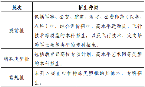 答:普通類分為提前批、特殊類型批和常規(guī)批三個錄取批次,錄取工作按三個批次依次進行。各批次包含的類型為: