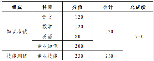 答:春季高考統(tǒng)一考試包括“知識”和“技能”兩部分,考試科目和分值如下表:
