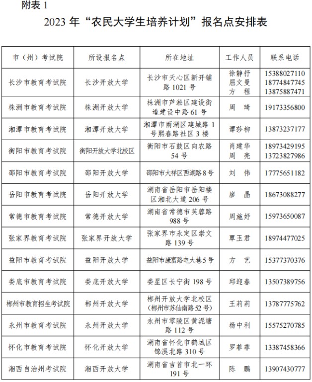 附表:1.2023年“農(nóng)民大學(xué)生培養(yǎng)計(jì)劃”報(bào)名點(diǎn)安排表