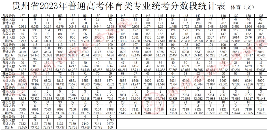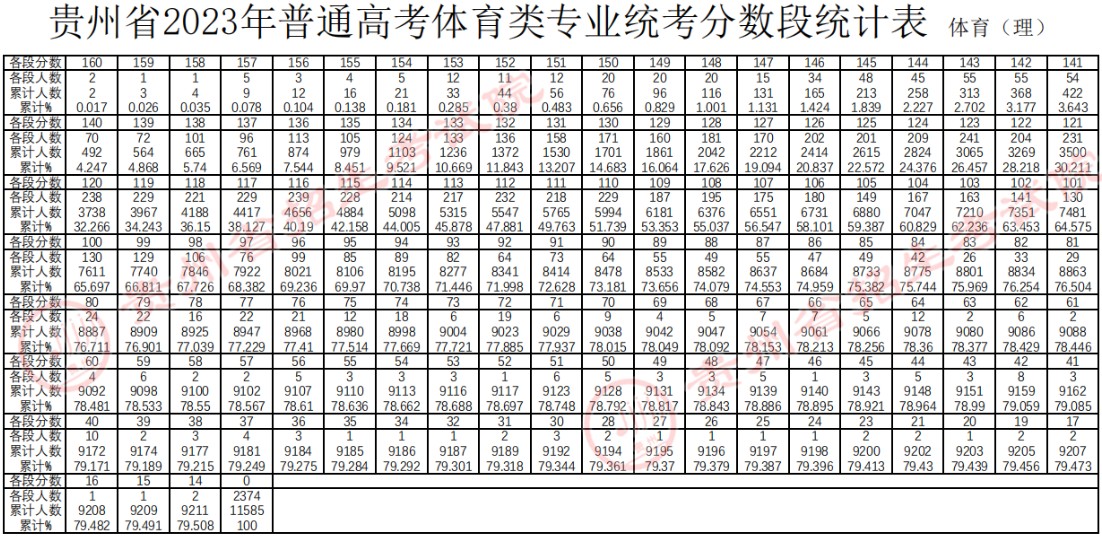 2023年貴州省普通高考體育類專業(yè)統(tǒng)考合格線、考生成績(jī)、分?jǐn)?shù)段統(tǒng)計(jì)表