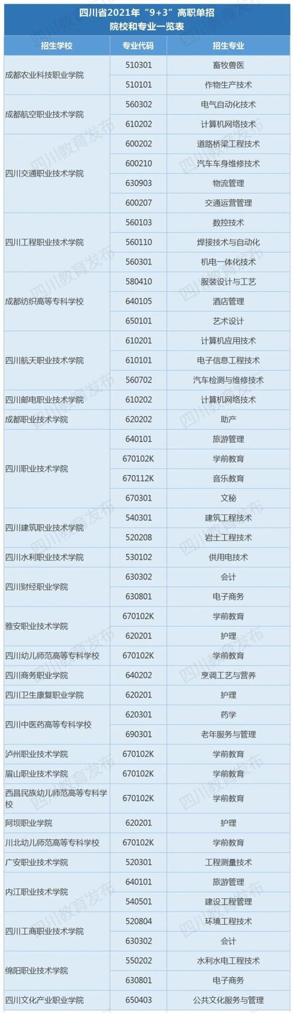四川省2021年“9+3”高職單招一覽表公布!
