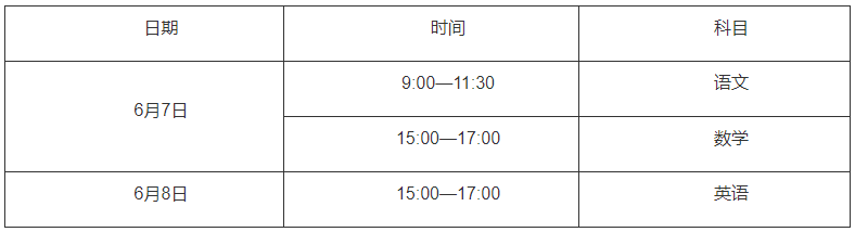 文化課實(shí)行全省統(tǒng)考,試題由省招辦依據(jù)現(xiàn)行職業(yè)高中教學(xué)大綱命制。考試時(shí)間安排如下: