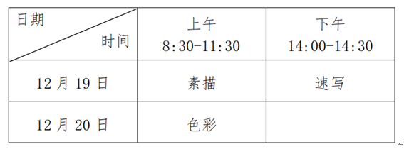 美術(shù)與設(shè)計類專業(yè)省統(tǒng)考安排在 2020年12月19日-20日進行,各科目考試時間具體安排如下: