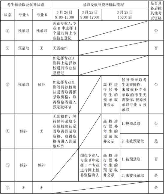 5. 取得兩個(gè)專業(yè)候補(bǔ)錄取資格的考生,須在3月25日9:00-12:00,在網(wǎng)上選擇其中一個(gè)專業(yè)進(jìn)行候補(bǔ)資格確認(rèn),如院校確認(rèn)其最終取得預(yù)錄取資格,無需操作,默認(rèn)被預(yù)錄?。ㄗ⒁猓捍_認(rèn)候補(bǔ)資格的考生不一定會(huì)被錄取,要根據(jù)該校預(yù)錄取考生的錄取確認(rèn)情況而定)。