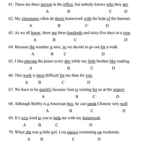 六、單句辨錯(共10小題,每小題1.5分,共15分)