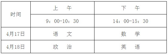 2.體育單招文化考試時間為2021年4月17日—18日。考試科目為語文、數學、政治、英語四科,每科150分,總分600分。文化考試具體時間如下: