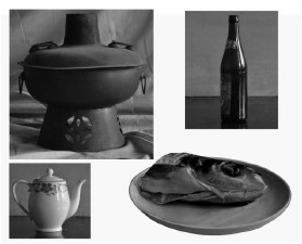 三、模擬寫生內(nèi)容:一個火鍋,一個茶壺,一個啤酒瓶,一個魚頭,一個瓷盤。(圖片小樣見