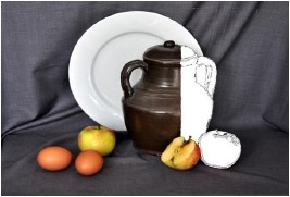 1.根據(jù)圖片資料提供的靜物,用色彩寫生的方法(并添加規(guī)定的默寫靜物內(nèi)容),自行組合構(gòu)