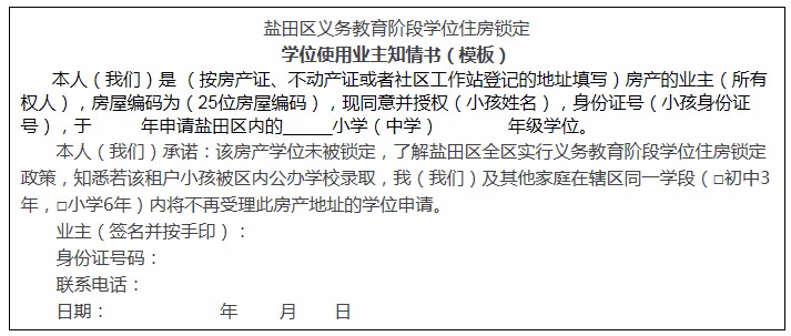 ④非自有產(chǎn)權(quán)房的須提供由業(yè)主簽字并按手印同意的《學位使用業(yè)主知情書》。非自有產(chǎn)權(quán)房的鹽田戶籍申請人且在鹽田區(qū)實際居住的,其所租住的房屋因已被鎖定或無法鎖定而無法提供《學位使用業(yè)主知情書》的,需簽署《學位申請服從調(diào)劑承諾書》,由區(qū)教育局在全區(qū)范圍內(nèi)統(tǒng)籌派發(fā)學位。《學位使用業(yè)主知情書》模板如下。