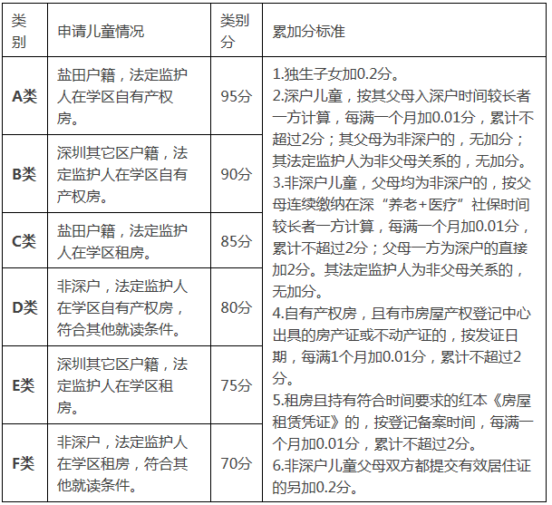 1.類別分:按申請兒童戶籍和監(jiān)護(hù)人住房情況,劃分為A、B、C、D、E、F六個學(xué)位申請類別。分類辦法及對應(yīng)分值見《鹽田區(qū)義務(wù)教育階段學(xué)校申請人入學(xué)積分表》(以下簡稱《積分表》)。
