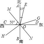 17.如圖,OD、OC、OB、OA分別表示東西南北四個(gè)方向,OM的方向是西偏北50°,OE的方向是北偏東15°,OE是∠MOG的平分線,∠MOH=∠NOH=90°.