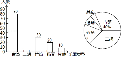(3)在扇形統(tǒng)計(jì)圖中“揚(yáng)琴”所對(duì)扇形的圓心角是度;