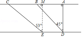 20.(8分)如圖所示,某施工隊(duì)要測量隧道長度BC,AD=600米,AD⊥BC,施工隊(duì)站在點(diǎn)D處看向B,測得仰角為45°,再由D走到E處測量,DE∥AC,ED=500米,測得仰角為53°,求隧道BC長.(sin53°≈