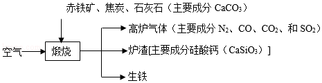 (1)生鐵屬于材料(填“合成”或“金屬”)。“高爐氣體”中的(填化學(xué)式)會導(dǎo)致酸雨。