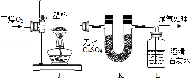 連接裝置,檢查氣密性,裝入試 劑并按如圖進行實驗。通入O2, 一段時間后,點燃J處酒精燈。 | 裝置K中無水CuSO4變 ①色 | 塑料燃燒產(chǎn)物中有H2O |