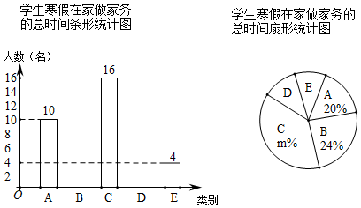 19.(7分)“勤勞”是中華民族的傳統(tǒng)美德,學(xué)校要求同學(xué)們在家里幫助父母做一些力所能及的家務(wù).在本學(xué)期開學(xué)初,小穎同學(xué)隨機調(diào)查了部分同學(xué)寒假在家做家務(wù)的總時間,設(shè)被調(diào)查的每位同學(xué)寒假在家做家務(wù)的總時間為x小時,將做家務(wù)的總時間分為五個類別:A(0≤x<10),B(10≤x<20),C(20≤x<30),D(30≤x<40),E(x≥40).并將調(diào)查結(jié)果制成如下兩幅不完整的統(tǒng)計圖: