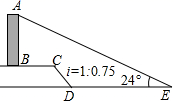 5.如圖,AB是一垂直于水平面的建筑物,某同學(xué)從建筑物底端B出發(fā),先沿水平方向向右行走20米到達(dá)點(diǎn)C,再經(jīng)過一段坡度(或坡比)為i=1:0.75、坡長為10米的斜坡CD到達(dá)點(diǎn)D,然后再沿水平方向向右行走40米到達(dá)點(diǎn)E(A,B,C,D,E均在同一平面內(nèi)).在E處測得建筑物頂端A的仰角為24°,則建筑物AB的高度約為(參考數(shù)據(jù):sin24°≈0.41,cos24°≈0.91,tan24°=0.45)( ?。?/span>