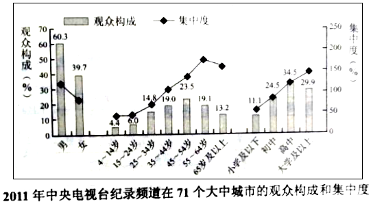 C.2011年,在71個大中城市的觀眾調(diào)查中,中央電視臺紀錄頻道觀眾構成最高的三類人群分別是:男性、45~54歲以及高中學歷。