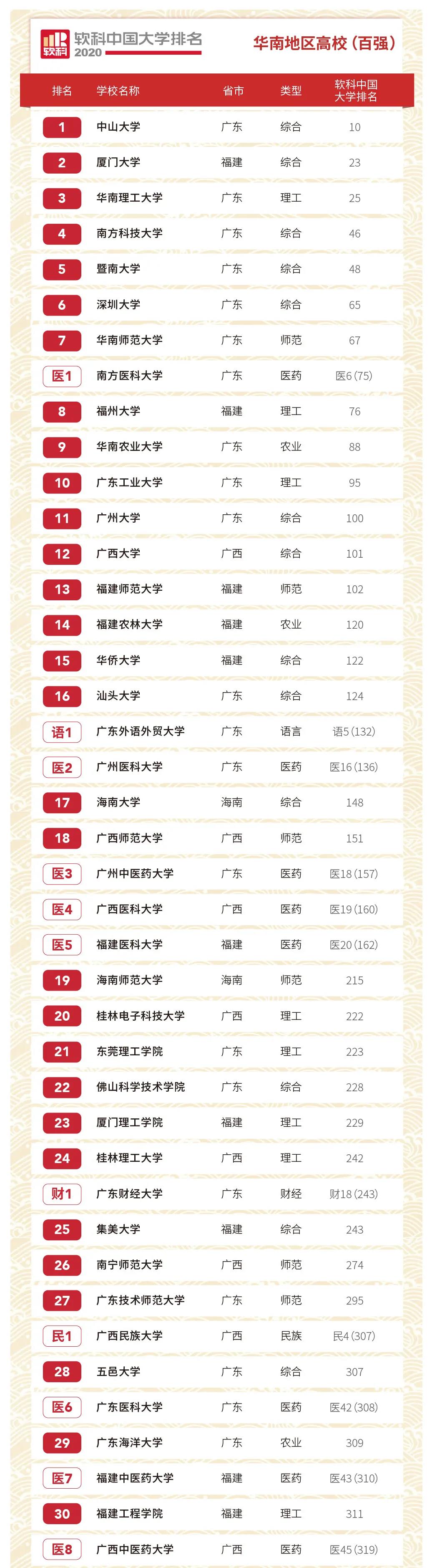 2020軟科中國(guó)大學(xué)排名——華南地區(qū)高校(百?gòu)?qiáng))如下: