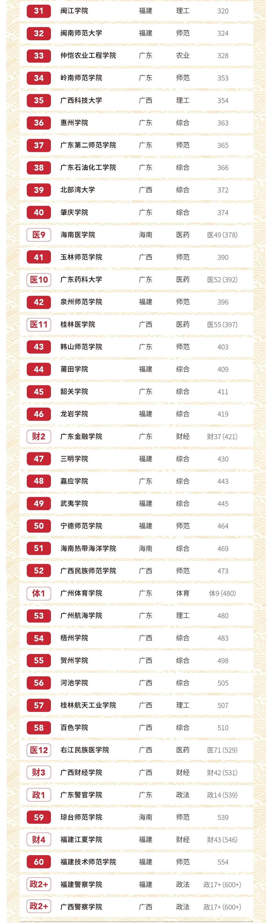 鐘南山院士曾坐鎮(zhèn)的廣州醫(yī)科大學(xué)在華南地區(qū)醫(yī)藥類大學(xué)中排名第二。據(jù)中國(guó)教育新聞網(wǎng)報(bào)道,此次新冠肺炎疫情中,在鐘南山的牽頭下,廣州醫(yī)科大學(xué)附屬第一醫(yī)院收治了廣州絕大部分新冠重癥患者,支援第八人民醫(yī)院的醫(yī)療隊(duì)全程參與8例危重癥、17例重癥的救治工作,馳援武漢的醫(yī)療隊(duì)累計(jì)診治逾400例次,為抗擊疫情貢獻(xiàn)了巨大力量。表現(xiàn)突出的醫(yī)藥類大學(xué)還有廣州中醫(yī)藥大學(xué)、廣西醫(yī)科大學(xué)、福建醫(yī)科大學(xué)和廣東醫(yī)科大學(xué)分別是華南地區(qū)排名第三至第六的醫(yī)藥類高校。