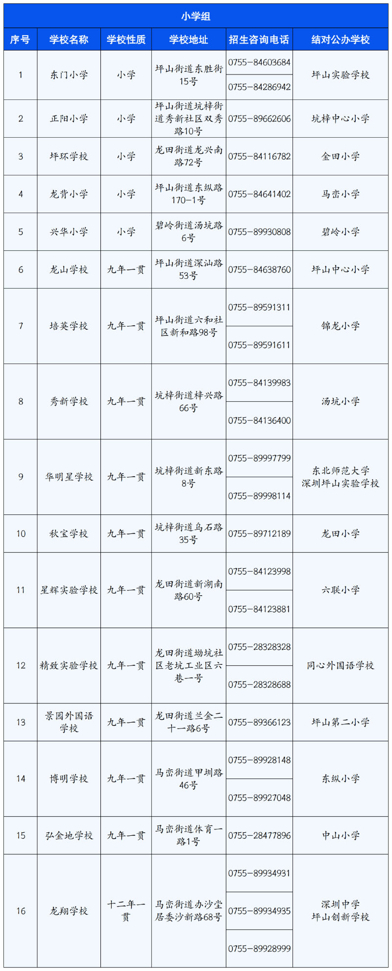 坪山區(qū)2022年民辦學(xué)校及結(jié)對(duì)幫扶公辦學(xué)校信息一覽表