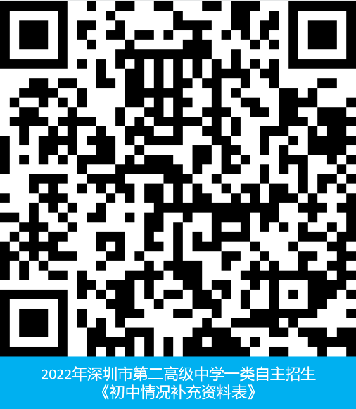 網(wǎng)上報(bào)名:6月17日 — 21日,考生通過“深圳市普通高中學(xué)校一類自主招生管理平臺”(https://www.szzk.edu.cn/zzzs/)報(bào)名我校自主招生,并在系統(tǒng)中錄入、上傳個(gè)人資料,報(bào)名成功后,識別下面二維碼,在線填寫《初中情況補(bǔ)充資料表》。
