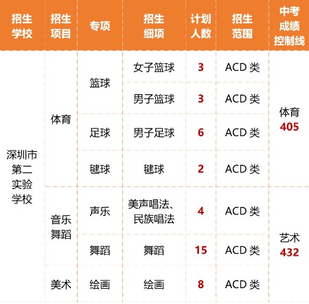 深圳市第二實(shí)驗(yàn)學(xué)校2022年繼續(xù)面向全市ACD類學(xué)生開展二類自主招生工作,主要招收具有體育、藝術(shù)專長(zhǎng)的學(xué)生,為高校培養(yǎng)和輸送優(yōu)秀的體育、藝術(shù)專項(xiàng)人才(體育、藝術(shù)高考)。招生計(jì)劃如下: