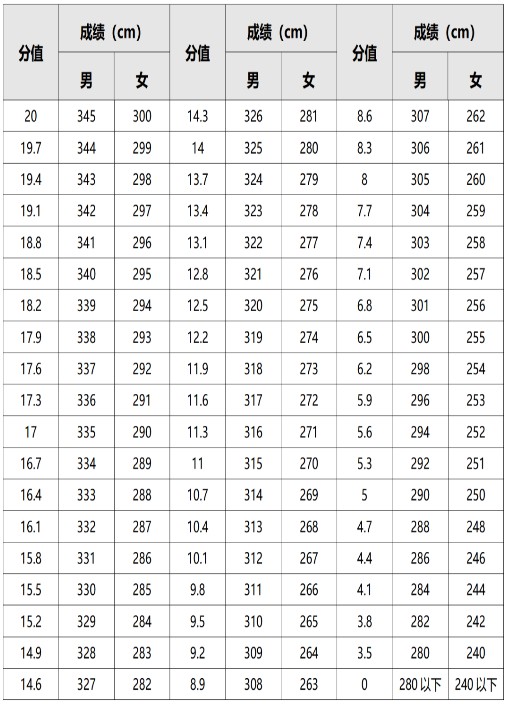 成績(米) | 分值 | 成績(米) | 分值 | 成績(米) | 分值 | 成績(米) | 分值 |
