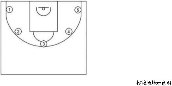Ⅸ、籃球考核內(nèi)容及評分標(biāo)準(zhǔn) (一)考核內(nèi)容 1.助跑摸高(20分) 2.1分鐘自投自搶投籃(20分) 3.多種變向運球上籃(20分) 4.實戰(zhàn)能力(40分) (二)考核標(biāo)準(zhǔn) 1.專項素質(zhì) 摸高 (1)考試方法:考生助跑起跳摸高,單手觸摸電子摸高器或有固定標(biāo)尺的高物,記錄絕對高度。助跑距離和起跳方式不限。每人測試2次,取最好成績(精確到厘米)。 (2)評分標(biāo)準(zhǔn): (二)專項技術(shù) 投籃 (1)考試方法:如圖所示,在以籃圈中心投影點為圓心,5.5米為半徑所劃的弧線上設(shè)置五個投籃點(球場兩側(cè)0度角處、兩側(cè)45度處和正面弧頂),每個點位放置5個球,共25個球。考生須從第1投籃點或第5投籃點開始投籃,按逆時針或順時針方向依次投完每個點位的5個球。測試時間為1分鐘。要求考生必須在弧線外投籃,球出手前雙腳不得踩線,若踩線投中則計為無效投籃,不得分。每人測試2次,取最好成績。 (2)評分標(biāo)準(zhǔn):每投中1球,得1分,投中20球(含)以上為滿分20分。