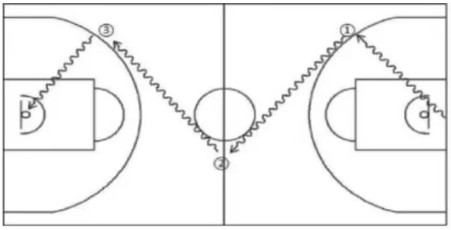 (1)考試方法:如圖所示,考生在球場端線中點外出發(fā)區(qū)持球站立,當(dāng)其身體任意部位穿過端線外沿的垂直面時開始計時??忌糜沂诌\球至①處,在①處做右手背后運球,換左手向②處運球,至②處做左手后轉(zhuǎn)身運球,換右手運球至③處,在③處做右手胯下運球后右手上籃。球中籃后方可用左手運球返回③處,在③處做左手背后運球,換右手向②處運球,在②處做右手后轉(zhuǎn)身運球,換左手向①處運球,在①處做左手胯下運球后左手上籃。球中后做同樣的動作再重復(fù)一次,最后一次上籃命中后,持球沖出端線,考生身體任意部位穿過端線外沿垂直面時停止計時,記錄完成的時間。每人測試2次,取最好成績。