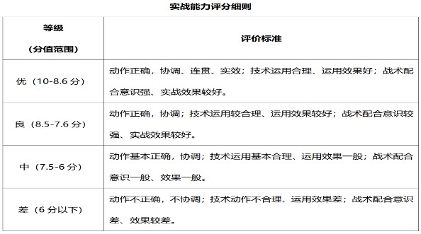 2.評分標(biāo)準(zhǔn):考評員參照實戰(zhàn)能力評分細(xì)則。獨立對考生動作的正確、協(xié)調(diào)、連貫程度,技、戰(zhàn)術(shù)運用水平以及配合意識等方面進(jìn)行綜合評定。采用10分制評分,分?jǐn)?shù)至多可到小數(shù)點后1位。