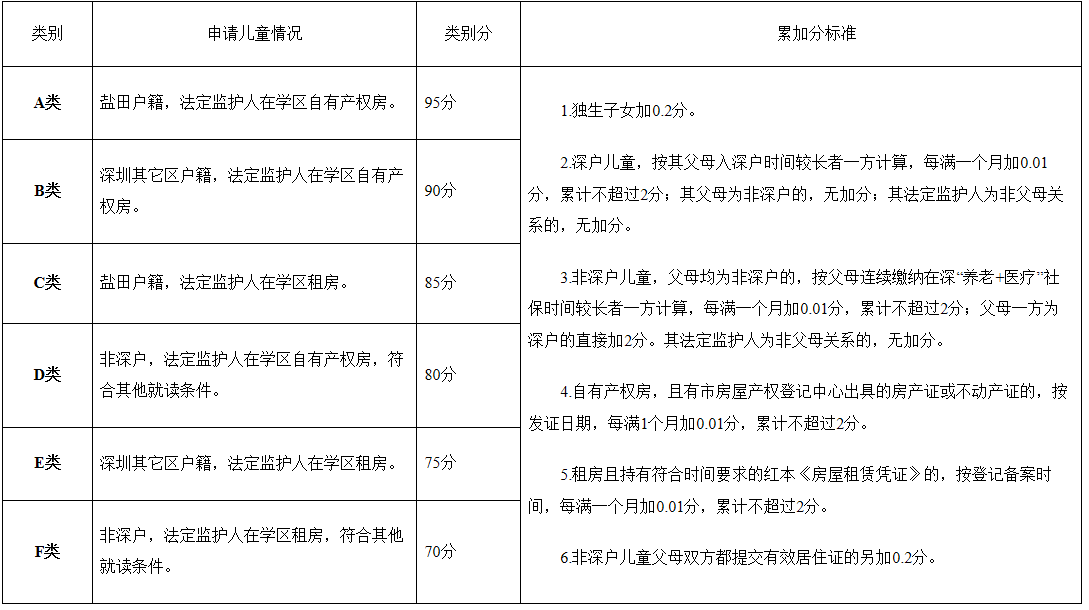 1.類別分:按申請兒童戶籍和監(jiān)護人住房情況,劃分為A、B、C、D、E、F六個學(xué)位申請類別。分類辦法及對應(yīng)分值見《鹽田區(qū)義務(wù)教育階段學(xué)校申請人入學(xué)積分表》(以下簡稱《積分表》)。