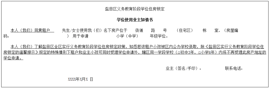 (4)非自有產(chǎn)權(quán)房的還需提供業(yè)主簽字同意的《學(xué)位使用業(yè)主知情書》,《學(xué)位使用業(yè)主知情書》模板: